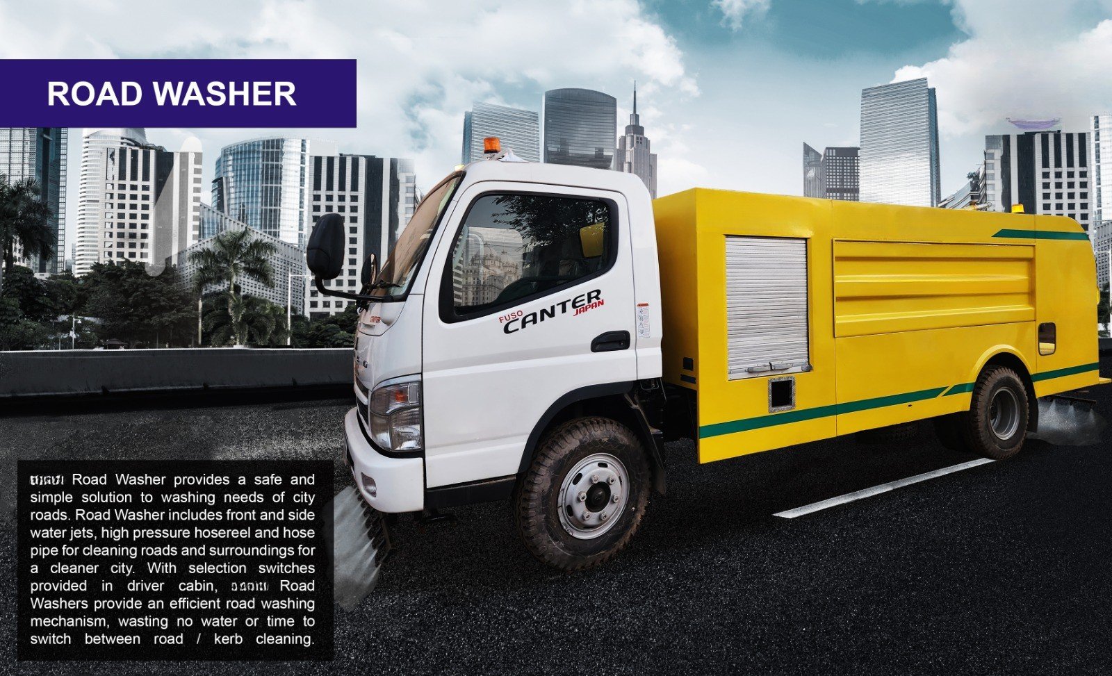 provides a safe and simple solution to washing needs of city roads. Road Washer includes high pressure front and side water jets, for cleaning both roads and sidewalks. With selection switches provided in driver cabin, Road Washers provide an efficient road washing mechanism, wasting no water or time to switch between road/sidewalk cleaning. Road Washer includes water sprinkling system to settle dust on road. Onboard high pressure hose reel and water gun helps with maximum approach to ensure that no corner or nook remains unwashed.